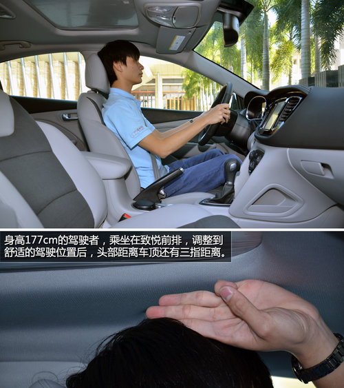 身高177cm的驾驶者,乘坐在致悦前排,调整到舒适的驾驶位置后,头部距离车顶还有三指距离。在未挪动前排的情况下,驾驶者坐到后排,腿部空间得益于2708mm的轴距优势,还有2拳多的距离,头部空间就仅剩2指的距离了。后排地板的中央突起让中间乘客舒适性无法保证。