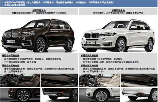 除了原厂的标准造型之外,全新宝马X5还提供给消费者三种不同的外观风格套件,包括了越野风格套件、卓越风格套件和M运动套装,另外还提供了11种车漆的颜色供消费者自主选择。
