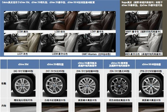 内饰方面,全新一代宝马X5依旧使用了和在售车型类似的横贯式造型,只是在细节设计上存在细微的不同,并加入了Dakota和Nappa两种不同材质的真皮内饰。而针对不同消费者的需求,在不同的车型上还有多达6种不同的配色方案可供选择。