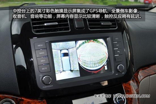中控台上的7英寸彩色触摸显示屏集成了GPS导航、全景倒车影像、收音机、音响等功能,屏幕内容显示比较清晰,触控反应稍有延迟。全景倒车影像为左右分屏显示,左侧为全车俯视角度,右侧则可以任意切换四面的某一个视角,使用起来非常方便。