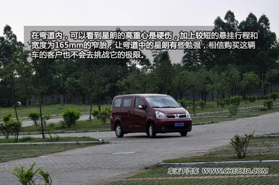 在弯道内,可以看到星朗的高重心是硬伤,加上较短的悬挂行程和宽度为165mm的窄胎,让弯道中的星朗有些勉强,相信购买这辆车的客户也不会去挑战它的极限。星朗的方向盘采用液压助力转向形式,转向轻盈,路感比较模糊。