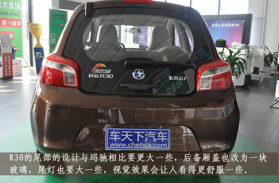 相比起车头,车尾的设计和玛驰相比,变化更是天翻地覆,R30采用这个级别微车常见的黑色玻璃板作为尾门,但看上去比较平直,和车顶线条的过渡不算太协调。尾灯的造型也比较普通,不过面积比玛驰大不少,黑暗中看起来更为显眼。