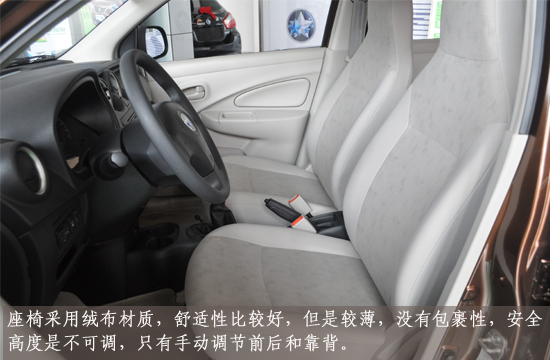 前排座椅采用一体式头枕的设计,角度有点往前倾,头靠上去后是有点往下的角度,不算十分舒服。同时,安全带高度是不可调的,按照它的设计高度基本能覆盖大部分人。但是这样的设计对于身材偏高或偏低的驾驶员来讲有些照顾不周。