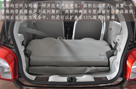 后备厢受玻璃尾门的影响,R30的开口面积比原来玛驰的金属尾门要小一些,实用性方面是要打折扣了。但尾厢的空间并没有产生变化,放置一个常规的行礼箱也是不成问题的。高配的两款车型后排可以整体放倒,放倒后虽没能实现全平,可扩大至537L超大行礼厢,足以放置一些中小型的家电。