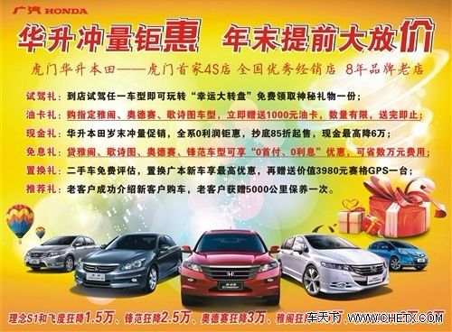 岁末将至,广汽本田华升店感恩诚献!据记者获悉,虎门华升本田为冲量完成厂家给予的年度销售目标,店内正火热开展"岁末感恩钜惠,冲量抄底价大放送"大型优惠盛宴!