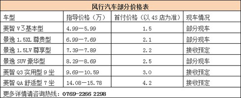 近日,小编从东莞兴隆寮步4S店获悉,为迎接新年,也为给广大消费者提供尽可能多的选择与服务,东莞兴隆汽贸与多家银行、金融公司强强联手,整合按揭、保险、上户等业务,倾力打造方便、快捷、多选择的金融服务。风行汽车首付3成,最低1.5万轻松开回家。详情如下表: