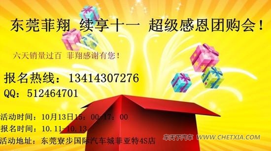 【车天下汽车网东莞讯】十一车展东莞达隆菲亚特狂揽153个订单的骄人成绩,其中菲翔(报价 参数 图片 论坛)单一车型126个,进口车27个,为感谢广大朋友们对东莞菲亚特的支持,厂家与东莞达隆特意举办“广汽菲亚特续享十一 感恩团购惠”活动。如果您错过了国庆车展,或是您还在犹豫徘徊,请到东莞达隆来!来东莞达隆,续享车展价格。