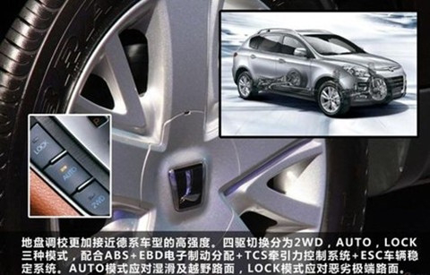 而另一方面,纳智捷 大7 SUV(报价 参数 图片 论坛)也在操控性上赋予了几近苛刻的标准,融合了特别强化的前麦弗逊悬挂系统、可扩充4WD的LB扭力复合式后悬挂系统、智能型避震器缓冲垫、高感度避震器以及先进的电子控制4WD五大先进设计。在设计之初,为了获得最佳调教结果,不惜耗费巨资,纳智捷 大7 SUV几乎跑遍欧洲各大知名山路,并在西班牙试车场进行一连串复杂测试。后续还在国内黑河、上海、吐鲁番等地进行“三高”实验,最终的成绩,就是纳智捷 大7 SUV的底盘不仅保持了欧系的舒适、稳健特性,同时完全符合国内环境,兼容操控安全性和乘坐舒适性两种特质。如此精心打造,其品质自然上乘。顺便说一句,从手动操控反应和主动识别反应上,纳智捷大7 SUV的电控四驱系统绝对值得称道。