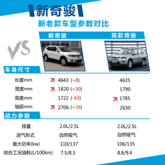 现款奇骏车身尺寸分别为4635/1790/1785mm,轴距为2630mm,而新款奇骏轴距在现款基础上加长了76mm,其乘坐空间及舒适性有了很大提升,不仅如此,新奇骏在动力方面也有所提升,新车在动力方面依然延用了现款的2.0L和2.5L自然吸气式引擎,其最大功率分别为110kw和137kw,百公里油耗则分别为7.5L和8.3L,在动力提升的同时,也充分提升了其燃油经济性。
