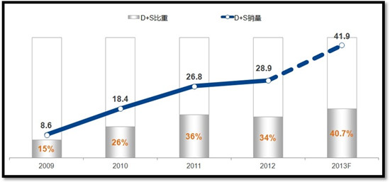 2013年,也是北京现代企业品牌力全面提升的一年。名图的加盟,不仅为北京现代的销量提升做出贡献,也壮大了北京现代D+S阵营,其12月销量过万的优异表现,更是带动北京现代12月单月D+S占比创下49%的纪录,突破历史新高。2013年1-12月,北京现代D+S比例占比达到40.7%,圆满完成40%的既定目标,比2012年34%的比例提高了19.7%。从2009年的15%,到今年的40.7%,北京现代D+S销售占比在五年内提高了71%。