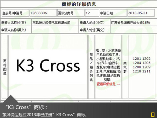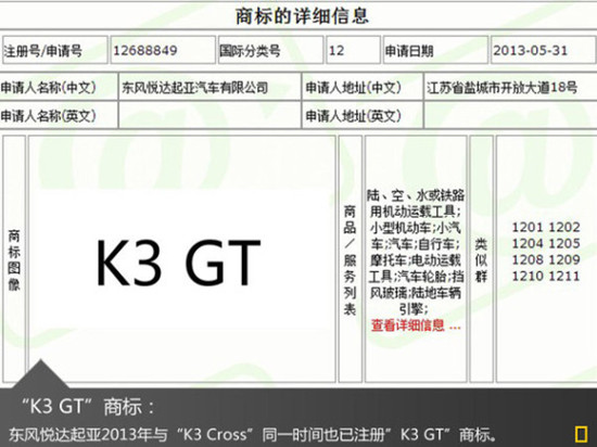 【车天下汽车新闻】随着东风悦达起亚第三工厂首台量产车投入仪式的落幕,东风悦达起亚宣告了其第三工厂已具备投产能力,百万产销发展战略规划也迈上了一个新的台阶。东风悦达起亚总经理苏南永此前在接受媒体采访时表示:“2014年会有两款新车投放新厂,第一款车在明年4月份投产,新车叫K3S,S代表动感。”近日,网通社从国家工商总局了解到:东风悦达起亚已注册“K3 Cross”以及“K3 GT”等多个商标。未来东风悦达起亚将效仿大众朗逸(报价 参数 图片 论坛)模式,有望推出K3跨界版等多款车型,对此苏南永也表示:未来几年,东风悦达起亚将努力研发新车,开拓市场。