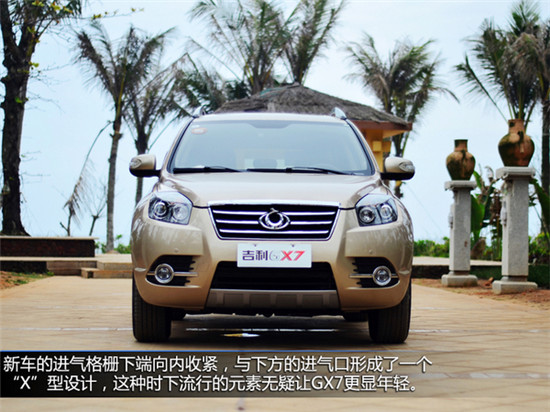 2014款吉利GX7整车造型更加符合潮流,新车的进气格栅下端向内收紧,与下方的进气口形成了一个“X”型设计,这种时下流行的元素无疑让GX7更显年轻。而前雾灯周围加入了镀铬修饰,也为新车前脸平添几分时尚元素。经过这些不大不小的修改,GX7几乎已经脱离了丰田第三代RAV4的影子,让人耳目一新。