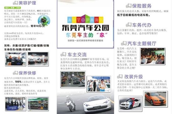 东莞汽车公园,位于市中心东大道会展中心旁,是由专业团队顶级策划师运营策划,实行会员制度的车主人气系统,2000平米专用停车场,是东莞创新型一站式美容保养维修改装专业基地,东莞车主的家!到东莞汽车公园消费,100%正品,100%的优质服务,100%的合理报价!即将开放,全城关注!