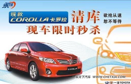 【车天下 东莞车市】小编给您透露一个消息:5月24日-5月25日,永佳丰田“现款卡罗拉(报价 参数 图片 论坛)清库,现车限时秒杀”。错过了五一车展的车主们不要感到遗憾,本周末永佳丰田现车限时秒杀让您惊喜不断!活动期间,购车的客户均可享受超低限时秒杀特价,还可参与“砸金蛋”活动!现款卡罗拉清库最高优惠23000元(报价 参数 图片 论坛)!还在犹豫什么?赶快行动起来,到永佳丰田过个愉快的周末!东莞永佳丰田销售热线:400-999-2048