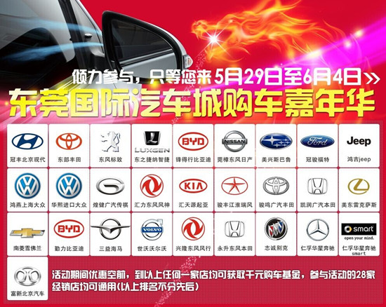【车天下 东莞车市】看车、试车、买车!?不用怀疑和考虑,尽在东莞国际汽车城购车嘉年华(报价 参数 图片 论坛)!由东莞市国际汽车城管理局主办、多个汽车品牌和多家优秀汽车经销商参与的,东莞市国际汽车城购车嘉年华于5月29日至6月4日于东莞寮步国际汽车城拉开帷幕。