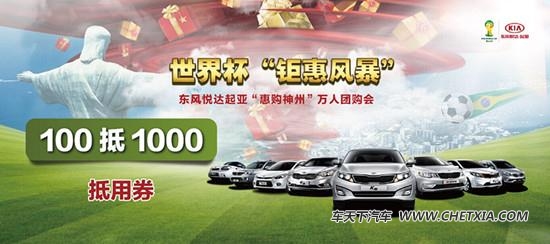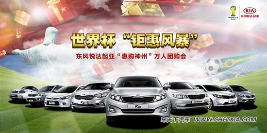 【车天下 东莞车市】2014年6至7月,巴西世界杯风暴即将席卷全球,掀起球事风云。作为巴西世界杯亲密合作伙伴,东风悦达起亚也借此东风拉开了“惠购神州”万人团购会的帷幕。6月29日,“钜惠风暴”登陆东莞,全城万民抢车季开启。报名热线: 81689568、81689555!