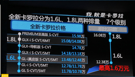 作为丰田汽车当家花旦的卡罗拉(报价 参数 图片 论坛),从1966年开始,卡罗拉在48年的时间里历经10代传承,畅销全球154个国家和地区,累计销售超过4100万辆。在6月19日,一汽丰田全新第11代卡罗拉正式上市。新车在分别搭载1.6L/1.8L自然吸气发动机基础上根据配置的差异化共计推出12款车型,新车售价区间10.78-15.98万元(报价 参数 图片 论坛)人民币。至此,一汽丰田方面也借第11代卡罗拉上市提出了月销两万台的新目标。而下来的文章里我们则跟您聊聊笔者对于本次卡罗拉售价方面的看法及展望。