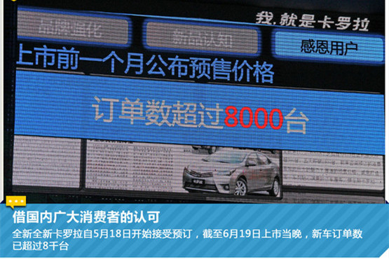 2004年,一汽丰田导入了第9代COROLLA,命名为“花冠(报价 参数 图片 论坛)”。2006年,第10代卡罗拉在中国进行了全球首发,并定名为“卡罗拉”。十年来,“花冠”与“卡罗拉”共同组成的COROLLA系列在中国销售了近200万辆,是一汽丰田最重要的主销车型,其销量占到一汽丰田的半壁江山。凭借国内广大消费者的认可,全新全新卡罗拉自5月18日开始接受预订,截至6月19日上市当晚,新车订单数已超过8千台。