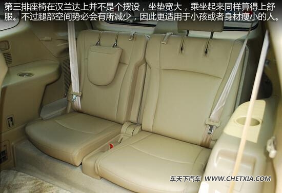 汉兰达的轴距和车身长度达到了2790mm和4795mm,这样就为前后三排乘客留出了比较充裕的乘坐空间。同时SUV车型较高的车内高度和坐姿也会使乘客在长途乘坐时更为舒适。如果不使用第三排座椅,你也可以完全把它收入地板之下,扩展出一个很大的后备箱空间。