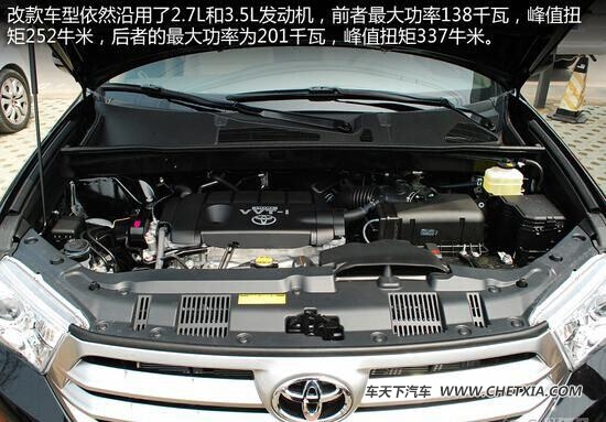 汉兰达采用2.7和3.5两种排量的自然吸气发动机,前者搭配6速自动变速器,后者匹配5速自动变速器,发动机201kW的最大功率和337Nm的最大扭矩让这套动力系统在公路性能上表现不错,其0-100公里/小时加速成绩在8秒出头,对于这么一个大块头来说已经很不错了。
