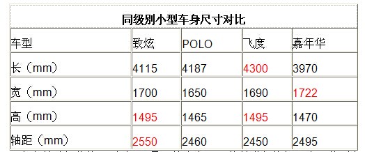 致炫的尺寸方面,长、宽、高分别为(4415mm*1700mm*1495mm),轴距为2550mm。车身高度和轴距均超越了同级别的本田飞度(报价 参数 图片 论坛)、大众Polo、福特嘉年华(报价 参数 图片 论坛)对手车型。足以见得,这款AO+车型货真价实。