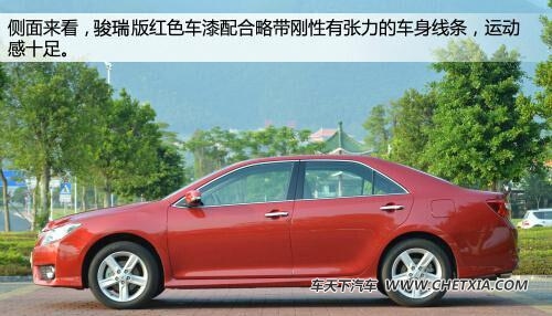 凯美瑞骏瑞与标准版在轴距与车身长度方面均无变化,只是前后大灯和前后保险杠处略有调整,骏瑞车型则是在下部增加了一个运动侧裙,极大的提升了整车的运动感。