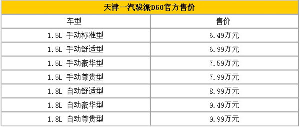 【车天下汽车网讯】10月27日,天津一汽骏派D60(报价 参数 图片 论坛)在北京宣布正式上市销售,共推出7款车型,售价6.49-9.99万元(报价 参数 图片 论坛)。