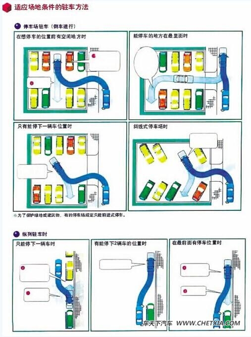 在停车场停车,一般有四种可能出现的情况,图示中已经说得很明白,这里就不再赘述。其实,停车和开车一样,都是熟练活儿。只要掌握了一点点技巧,再加上经常练习,停车入位将不再困难。