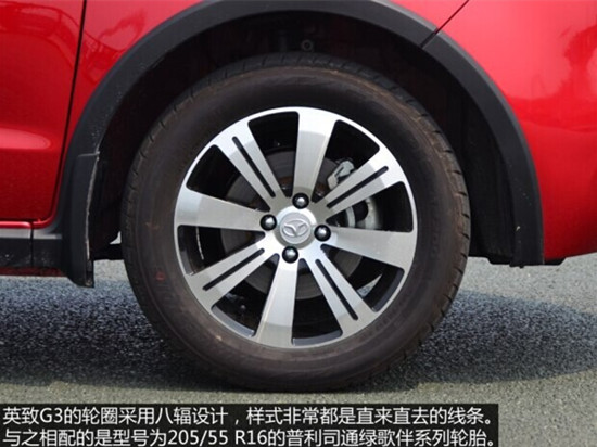 外形尺寸方面,英致G3的长宽高分别为4066*1737*1657(mm),轴距为2502mm,在同级别主要竞争对手中处于中等水准。此外它的轮胎采用了普利司通绿歌伴系列,这在同级车型中属于非常高的标准了。