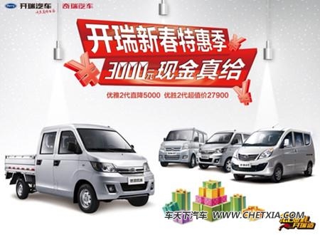 据悉,开瑞汽车“新春特惠季”活动截止2月底,买车抢3000元大礼当然要赶在春节前。