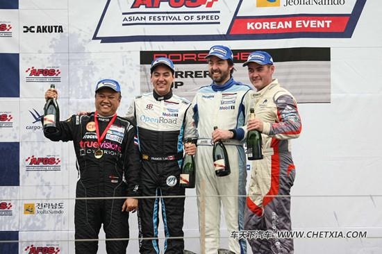 【车天下汽车网讯】韩国。亚洲保时捷卡雷拉杯的28辆Porsche 911 GT3 Cup 战车在韩国国际赛车场上展开了第三、四回合名次的激烈角逐。范德瑞(Chris van der Drift)两次领跑全场,站在领奖台最高处,接受香槟的洗礼。伯菲特(Egidio Perfetti)成功一路领跑,分别摘下两轮比赛全场和B组冠军。第三个冲线的车手是主场作战的崔明吉。