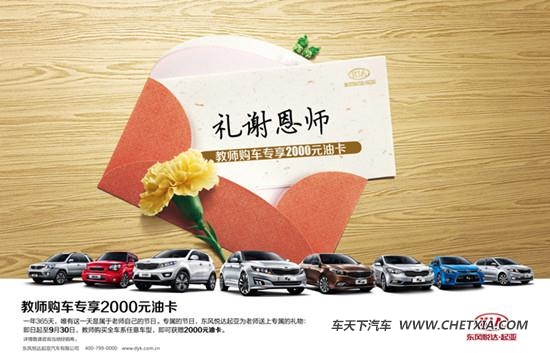 9月1日至30日,凡教师消费者到东莞起亚汇天源4S店购买东风悦达起亚全车系任意车型,在展厅成交价基础上,还可专享2000元(报价 参数 图片 论坛)油卡特别补贴。活动期间,汇天源店还将陆续开展专场团购或巡展活动等,为广大教师消费者带来更多元、更优惠的购车选择。