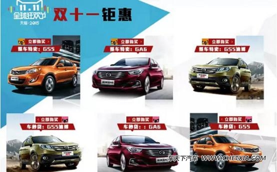 即日起到11月14日阿里汽车“双11”全球狂欢,凡在广汽传祺天猫旗舰店下订GS5速博、GS5、GA6,预售期支付3999订金,双11当天支付尾款即可享受到特价传“祺”。GS5速博,超强动力,从芯开启,一口价购车再享折上折,油卡、全险、动力升级任你选。GS5,引领都市风尚(报价 参数 图片 论坛)SUV,双11低至73折优惠。GA6,新时代精英座驾,一口价购车再享 购置税减半,动力升级二选一,赢100%神秘好礼等给力优惠。
