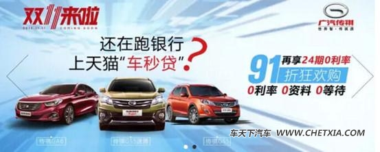 还在跑银行?上天猫车秒贷!0利率,0材料,0等待。本次“双11”活动期间,传祺推出三款车型:GA6、GS5速博、GS5参加车秒贷活动。用户登陆手机天猫一键授信,不仅可以在线下享受指导价91折优惠,更尊享24期0利率。