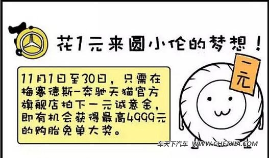11月1日至30日,每日一个购胎免单大奖等你来拿!只要在梅赛德斯-奔驰天猫官方旗舰店支付1(报价 参数 图片 论坛)诚意金,11月内前往线下授权经销商处购买轮胎,完成诚意金的抵扣核销,就自动进入了活动奖池,有机会赢取最高4999元的轮胎免单大奖。
